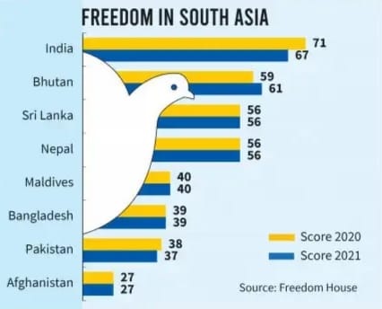 हाल ही में जारी ‘फ्रीडम इन द वर्ल्ड 2021’ रिपोर्ट में भारत की स्थिति को ‘स्वतंत्र’ से 'आंशिक रूप से स्वतंत्र' कर दिया है।
