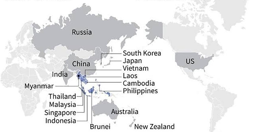- इसमें आसियान (दक्षिण-पूर्व एशियाई राष्ट्र संघ) के दस सदस्य देशों- ब्रुनेई, कंबोडिया, इंडोनेशिया, लाओस, मलेशिया, म्याँमार, फिलीपींस, सिंगापुर, थाईलैंड और वियतनाम के साथ 8 अन्य देश- ऑस्ट्रेलिया, चीन, जापान, भारत, न्यूज़ीलैंड, कोरिया गणराज्य, रूस एवं संयुक्त राज्य अमेरिका शामिल हैं।