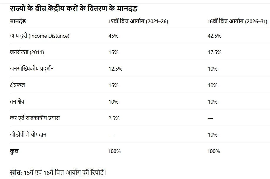 - राज्यों के बीच वितरण संशोधित कर-वितरण सूत्र पर आधारित है, जिसमें आय-अंतर (42.5%), 2011 की जनगणना के अनुसार जनसंख्या (17.5%), जनांकिकीय प्रदर्शन (10%), क्षेत्रफल (10%), वन एवं पारिस्थितिकी (10%) तथा GDP में योगदान के लिये नया 10% भार शामिल किया गया है, जबकि 15वें वित्त आयोग द्वारा प्रयुक्त कर एवं राजकोषीय प्रयास (Tax and Fiscal Effort) मानदंड को इसमें शामिल नहीं किया गया है।