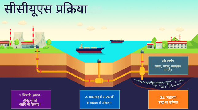 CCUS विद्युत संयंत्रों, उद्योगों या वायुमंडल से CO₂ को एकत्रित करता है और इसे भूवैज्ञानिक संरचनाओं में भंडारण के लिये ले जाता है या जलवायु परिवर्तन को कम करने हेतु औद्योगिक उपयोग करता है।