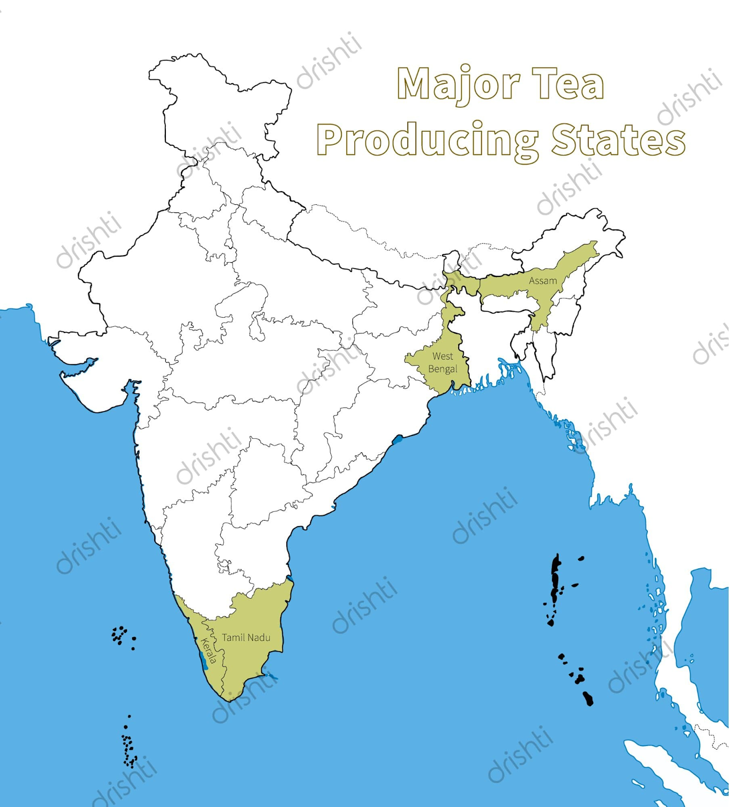 - चाय उत्पादक क्षेत्र: प्रमुख चाय उत्पादक राज्य असम (असम घाटी, कछार), पश्चिम बंगाल (डूआर्स, तराई, दार्जिलिंग), तमिलनाडु और केरल भारत के कुल उत्पादन का लगभग 96% हिस्सा पैदा करते हैं।