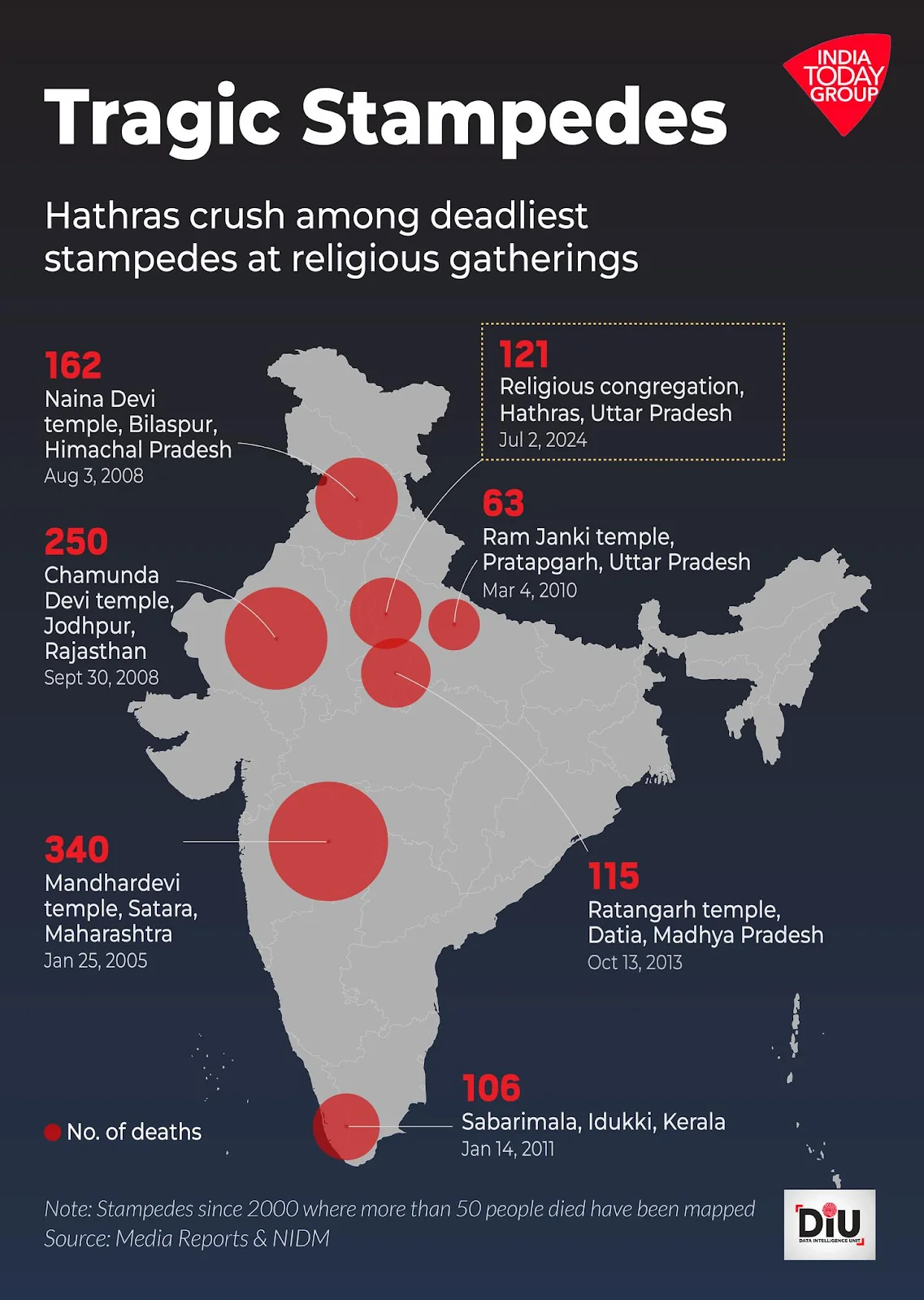 - हाथरस (2024): उत्तर प्रदेश में एक धार्मिक आयोजन के दौरान भगदड़ में कम-से-कम 121 लोग मारे गए, जिनमें ज़्यादातर महिलाएँ और बच्चे थे।