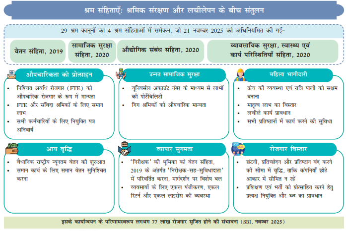 - संगठित विनिर्माण रोज़गार FY 24 में 6% वार्षिक वृद्धि के साथ बढ़ा (10 लाख से अधिक नौकरियाँ), जबकि श्रम संहिताओं ने गिग और प्लेटफॉर्म श्रमिकों तक सामाजिक सुरक्षा का विस्तार किया।