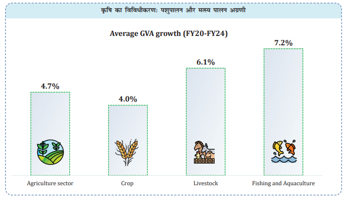 - भारत के कृषि क्षेत्र ने मज़बूत प्रदर्शन दिखाया, जिसमें पशुधन (livestock) का सकल मूल्यवर्द्धन (GVA) FY 15 से FY 24 के बीच लगभग 195% बढ़ा, जबकि मत्स्य उत्पादन में वर्ष 2014–24 के दौरान 140% से अधिक वृद्धि हुई।