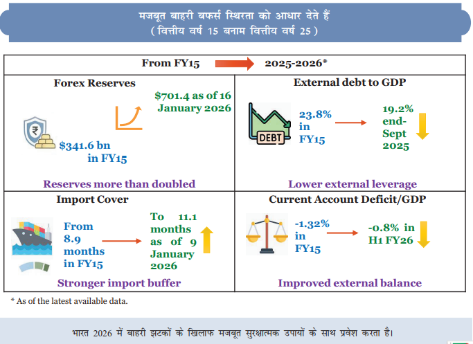 - वर्तमान खाता घाटा (CAD) मध्यम स्तर पर बना रहा (~1.3% of GDP, Q2 FY 26), जिसका समर्थन मज़बूत सेवा निर्यात और रिकॉर्ड रेमिटेंस (USD 135.4 अरब) ने किया। इसी के साथ विदेशी मुद्रा भंडार बढ़कर USD 701.4 अरब हो गया, जो 11 महीने के आयात कवर के बराबर है।