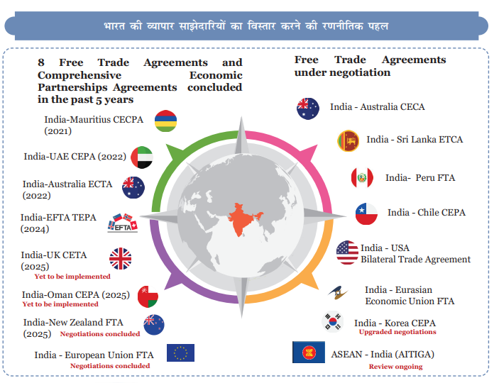 - भारत का बाहरी क्षेत्र उल्लेखनीय रूप से मज़बूत हुआ है। वैश्विक वस्तु निर्यात में इसकी हिस्सेदारी वर्ष 2005 से 2024 के बीच 1% से बढ़कर 1.8% हो गई और सेवाओं के निर्यात में 2% से बढ़कर 4.3% हो गई। इसके साथ ही व्यापारिक साझेदारों में भी व्यापक विविधता देखने को मिली है।