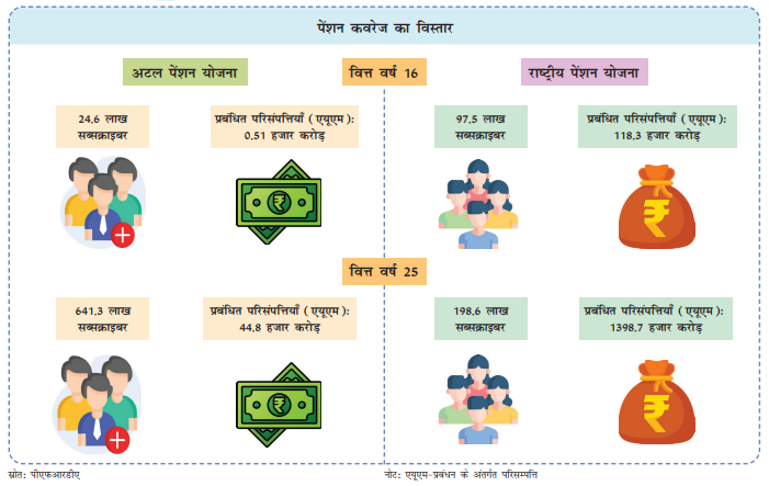 - पूंजी बाज़ाज़ार में भागीदारी में तेज़ी देखने को मिली है। जहाँ डीमैट खातों की संख्या 21.6 करोड़ से अधिक हो गई है। इसमें 12 करोड़ अनन्य निवेशक शामिल हैं (जिनमें लगभग 25% महिलाएँ हैं) और 5.9 करोड़ म्यूचुअल फंड निवेशक हैं, जिनकी संख्या गैर-मेट्रो शहरों में तेज़ी से बढ़ रही है।