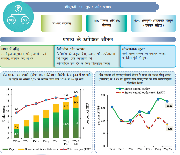 - इस सुधार-प्रेरित विकास का समर्थन करते हुए केंद्र का प्रभावी पूंजीगत व्यय महामारी से पहले के औसत 2.7% से बढ़कर वित्त वर्ष 2025 (FY 25) में GDP का लगभग 4% हो गया। वहीं पूंजीगत निवेश हेतु राज्यों को विशेष सहायता (SASCI) ने राज्यों को पूंजीगत परिव्यय को GDP के ~2.4% पर बनाए रखने के लिये सफलतापूर्वक प्रोत्साहित किया, जिससे सार्वजनिक निवेश को मांग और विकास के मुख्य चालक के रूप में मज़बूती मिली।