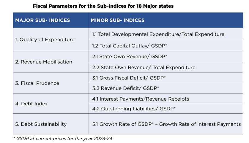 यह सूचकांक राज्यों का मूल्यांकन पाँच स्तंभों (five pillars) के आधार पर करता है: व्यय की गुणवत्ता (Quality of Expenditure), राजस्व सृजन (Revenue Mobilisation), वित्तीय अनुशासन (Fiscal Prudence), ऋण सूचकांक (Debt Index) और ऋण स्थिरता (Debt Sustainability)।