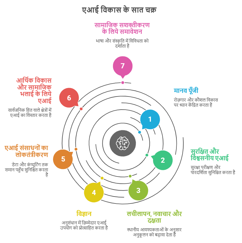 - सात चक्र (कार्य समूह): स्वास्थ्य, कृषि, सुरक्षित और विश्वसनीय AI, विज्ञान, समावेशन, AI संसाधनों का लोकतंत्रीकरण तथा आर्थिक विकास सहित विशेष विषयों पर केंद्रित।