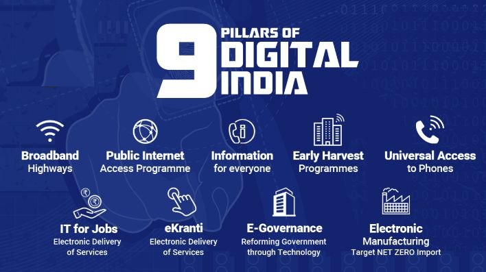- परिचय: यह इलेक्ट्रॉनिक्स और सूचना प्रौद्योगिकी मंत्रालय (MeitY) द्वारा संचालित एक प्रमुख पहल है। इसे जुलाई 2015 में शुरू किया गया था, जिसका उद्देश्य भारत को एक डिजिटल रूप से सशक्त समाज और ज्ञान अर्थव्यवस्था में बदलना है।