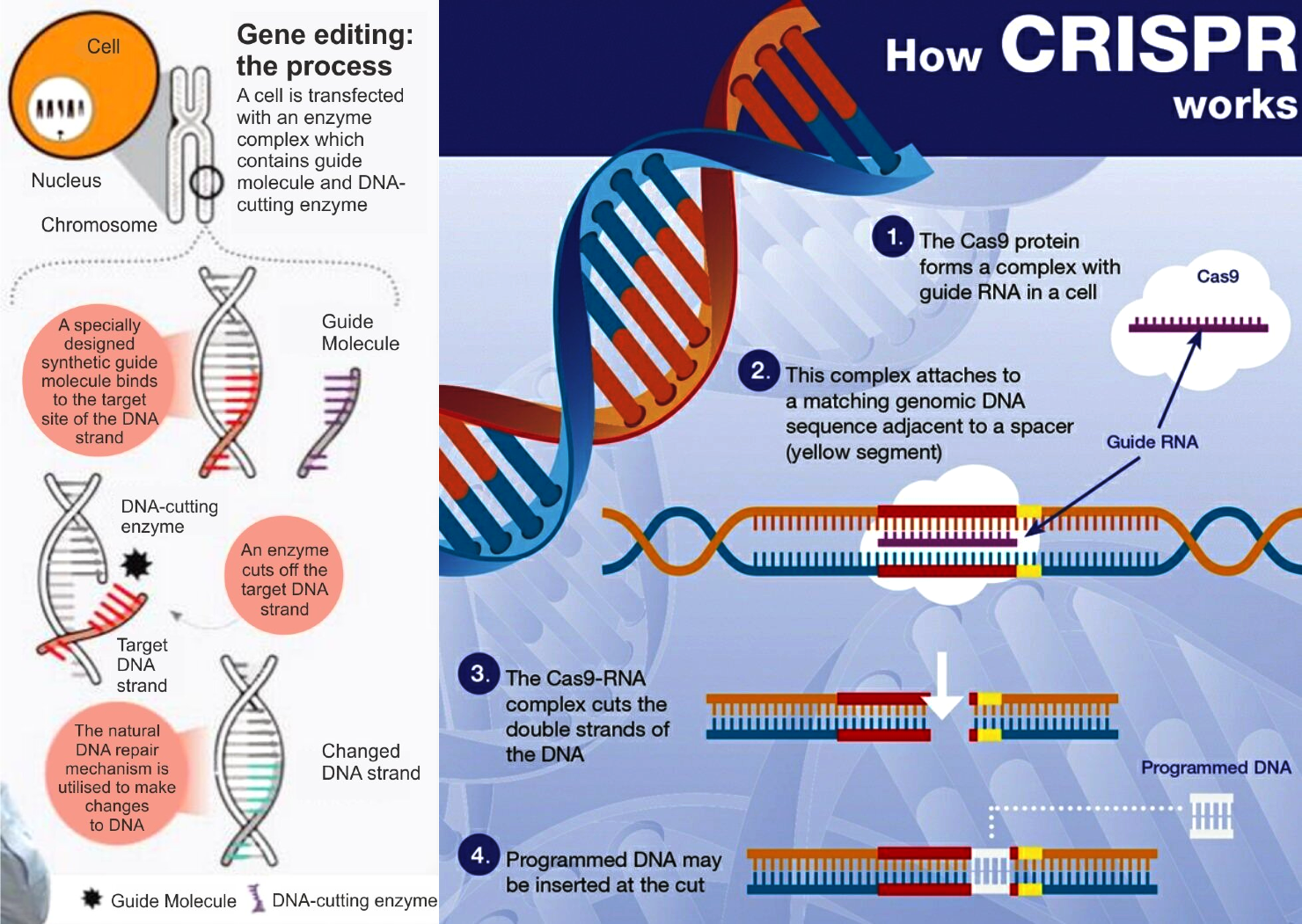 - कैंची (Cas9): यह एक एंज़ाइम है जो अणुगत कैंची के रूप में कार्य करता है। जब CRISPR सही स्थान का पता लगा लेता है तो Cas9 DNA की डबल हेलिक्स की दोनों स्ट्रैंड्स को उस सटीक बिंदु पर काट देता है।