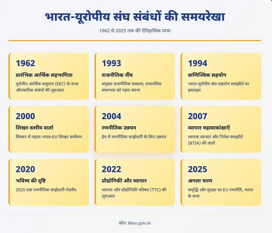 - संस्थागत ढाँचा: द्विपक्षीय संबंधों का मार्गदर्शन ‘भारत–EU रणनीतिक साझेदारी: 2025 के लिये रोडमैप’ द्वारा किया जाता है। बहु-स्तरीय संस्थागत ढाँचे की अध्यक्षता उनकी वार्षिक शिखर बैठकों द्वारा की जाती है, जिसकी शुरुआत जून 2000 में लिस्बन में आयोजित प्रथम बैठक से हुई थी।