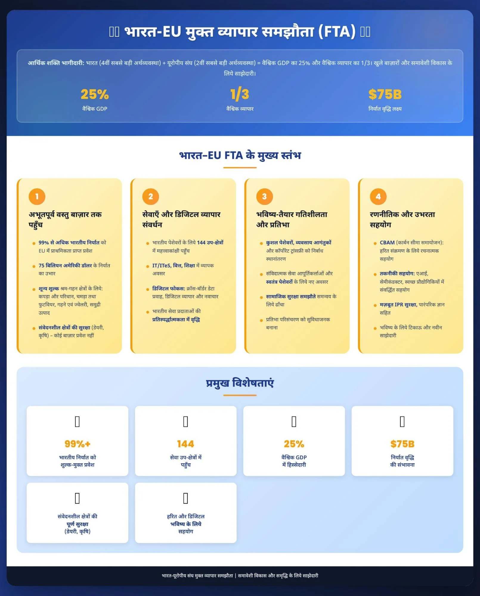 - भारत-EU ने एक ऐसे FTA पर वार्ताएँ पूरी की हैं, जो अभूतपूर्व बाज़ार पहुँच प्रदान करता है तथा श्रम-प्रधान क्षेत्रों और सेवाओं को बढ़ावा देता है।