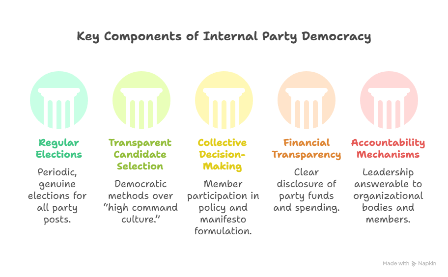 - परिचय: यह राजनीतिक दलों के संगठन, संरचना और कार्यप्रणाली को लोकतांत्रिक मूल्यों के अनुरूप ढालने की प्रक्रिया को दर्शाता है, जो सीधे प्रभावित करती है कि उम्मीदवारों का चयन व नेताओं का चुनाव कैसे होता है, नीतियाँ किस प्रकार निर्मित की जाती हैं और वित्तीय प्रबंधन कैसे संचालित किया जाता है।