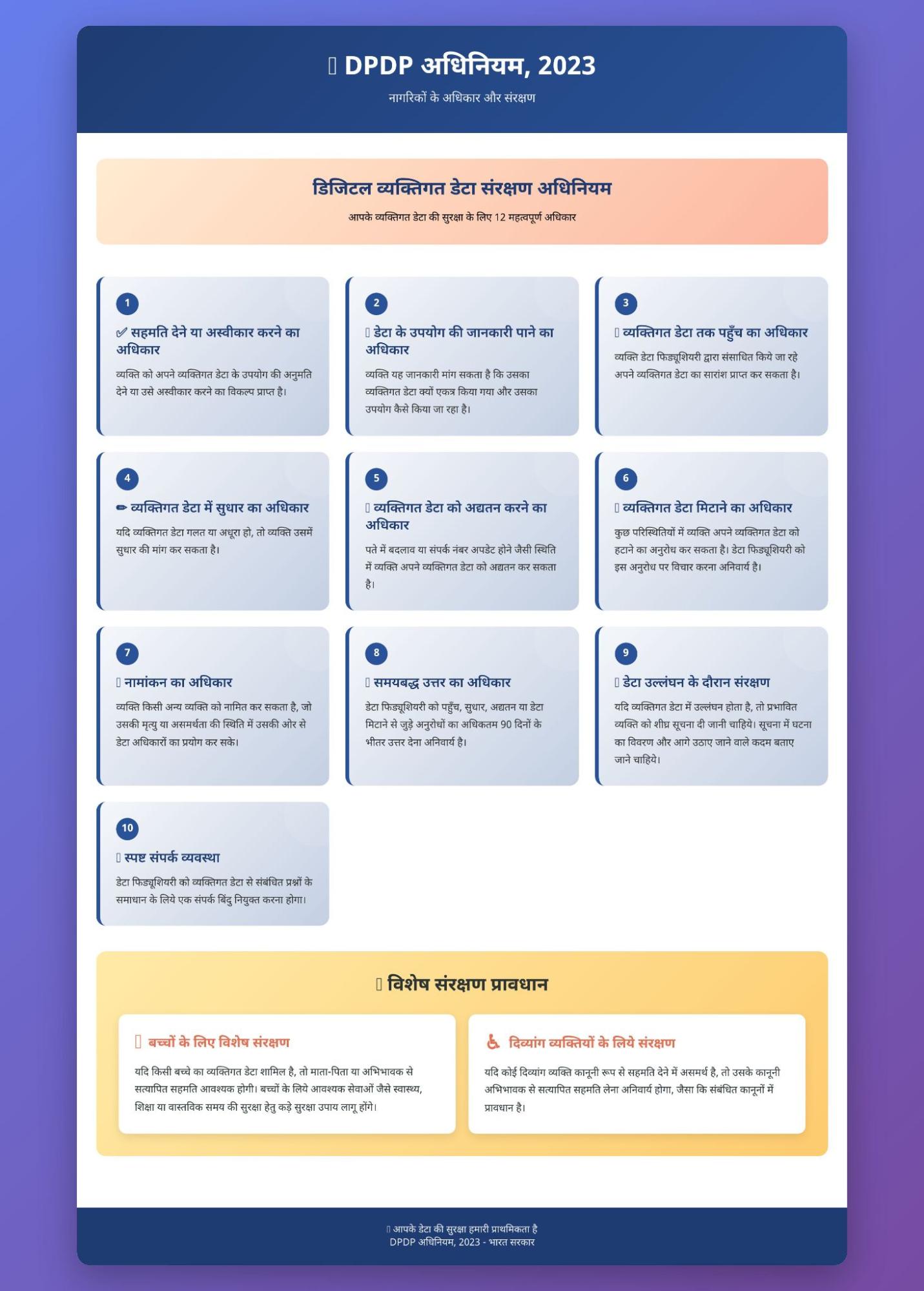 यह एक नागरिक-केंद्रित डेटा संरक्षण ढाँचा स्थापित करता है, जिसमें व्यक्तियों को डेटा प्रिंसिपल के रूप में सशक्त किया गया है और डेटा सँभालने वालों की जवाबदेही सुनिश्चित की गई है।