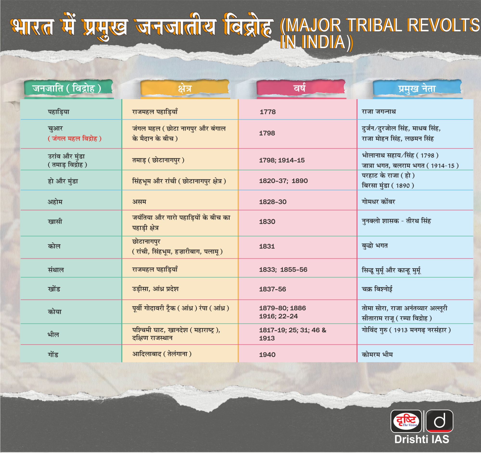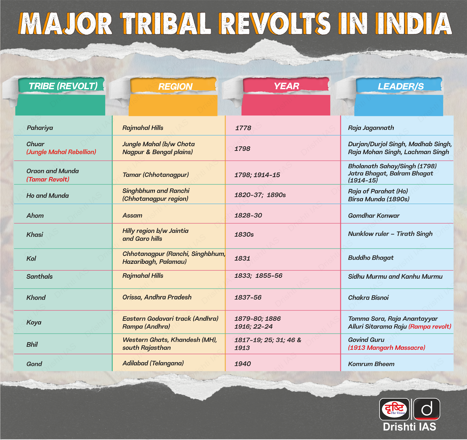 - अन्य जनजातीय नेतृत्वकर्त्ताओं—जैसे वीर नारायण सिंह, बादल भोई, राजा शंकर शाह तथा कुंवर रघुनाथ शाह—को भी औपनिवेशिक शासन के विरुद्ध उनके संघर्षों के लिये स्मरण किया जाता है।