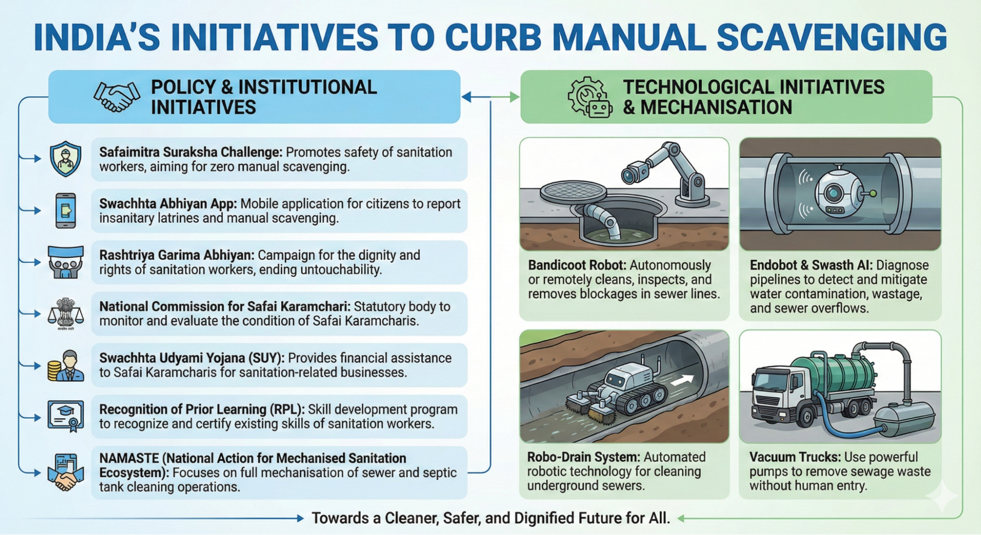 मैनुअल स्कैवेंजिंग को समाप्त करने के लिये पूर्ण मशीनीकरण, कड़े प्रवर्तन और सम्मानजनक पुनर्वास की आवश्यकता है ताकि जाति-आधारित शोषण को खत्म किया जा सके। मज़बूत संस्थान और सुरक्षित कार्य परिस्थितियाँ SDG 6 (स्वच्छ जल और स्वच्छता) तथा SDG 8 (सम्मानजनक कार्य) को आगे बढ़ाएँगी, जिससे भारत सभी के लिये गरिमा और समानता सुनिश्चित कर सकेगा।