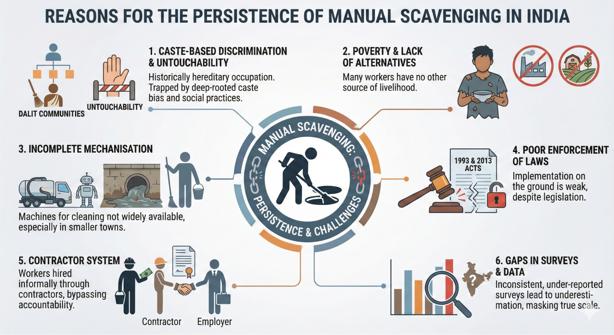 - मैन्युअल स्कैवेंजिंग मौलिक अधिकारों का उल्लंघन करता है, विशेष रूप से अनुच्छेद 17 (अस्पृश्यता का उन्मूलन) और अनुच्छेद 21 (गरिमा के साथ जीवन का अधिकार)।