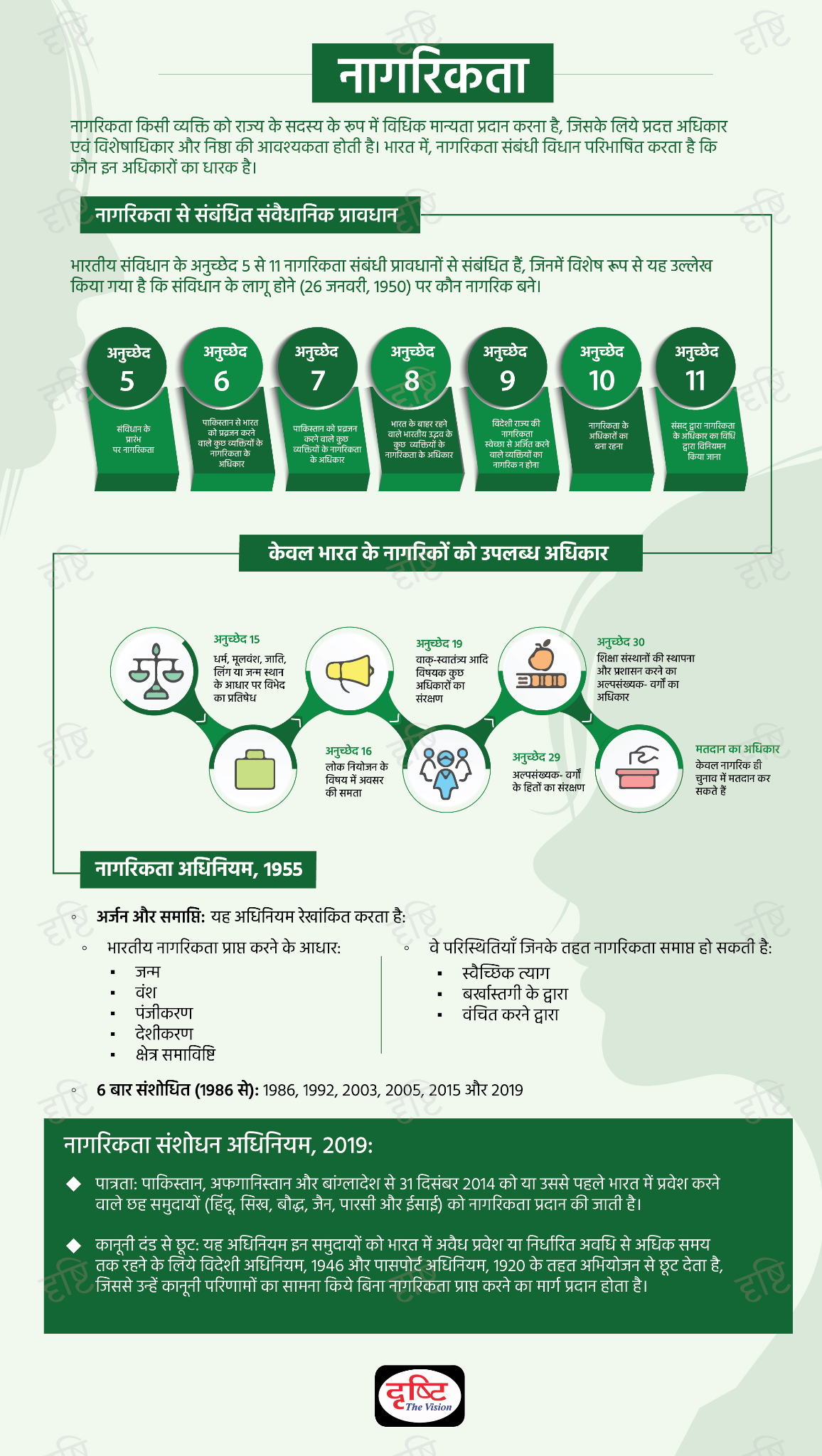 - संवैधानिक ढाँचा नागरिकता को एकीकृत और राष्ट्रीय अवधारणा के रूप में मान्यता देता है, जिसका विनियमन नागरिकता अधिनियम के अंतर्गत किया गया है। यह ढाँचा मौलिक अधिकारों के माध्यम से नागरिकों को गैर-भेदभाव और देश के भीतर स्वतंत्र गतिशीलता की गारंटी भी प्रदान करता है।