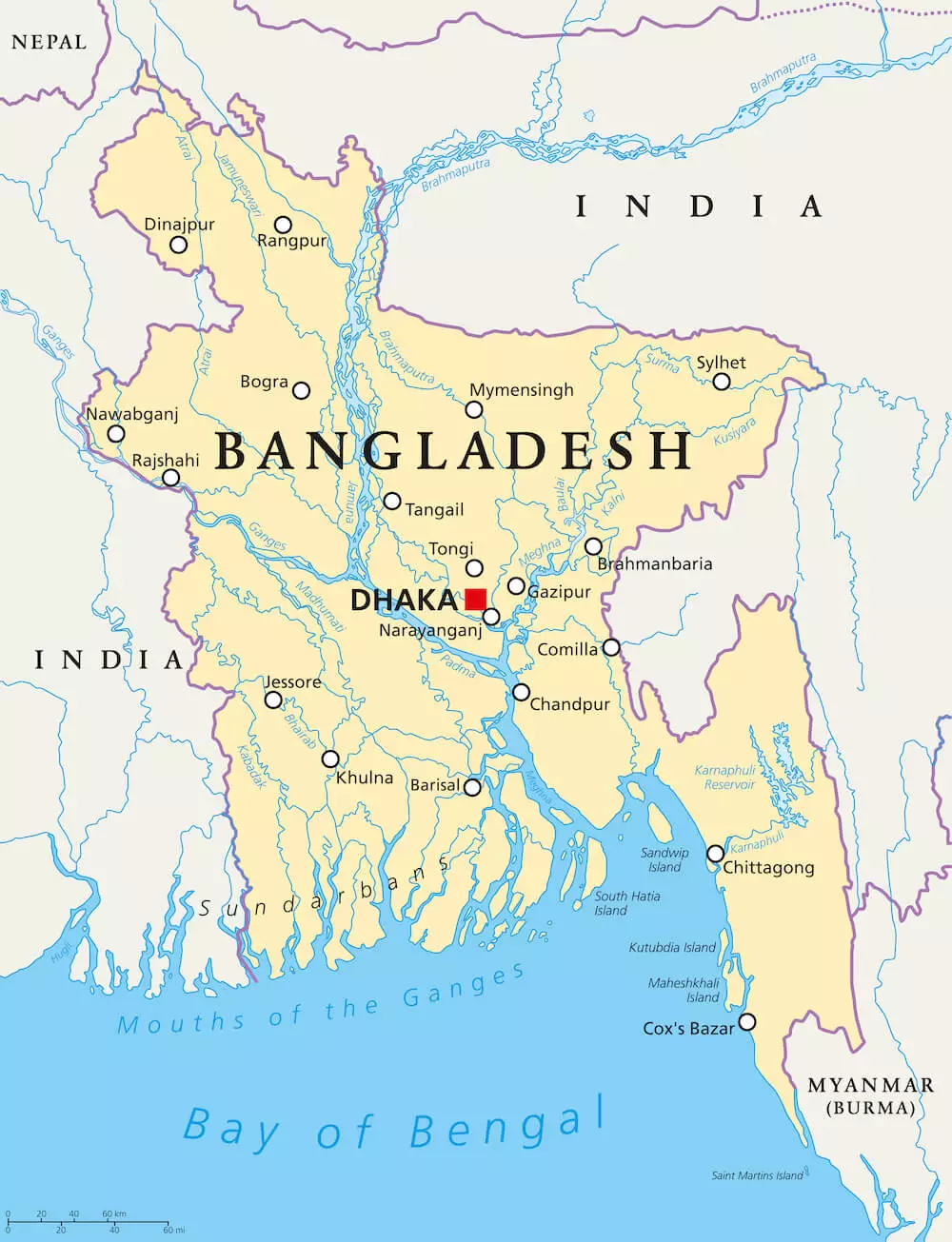 - परिचय: बांग्लादेश दक्षिण एशिया में स्थित एक देश है, जिसकी पश्चिम, उत्तर और उत्तर-पूर्व में भारत के साथ लंबी स्थलीय सीमाएँ हैं तथा दक्षिण-पूर्व में म्याँमार से इसकी सीमा लगती है। इसके दक्षिण में बंगाल की खाड़ी के साथ समुद्री तट भी है।