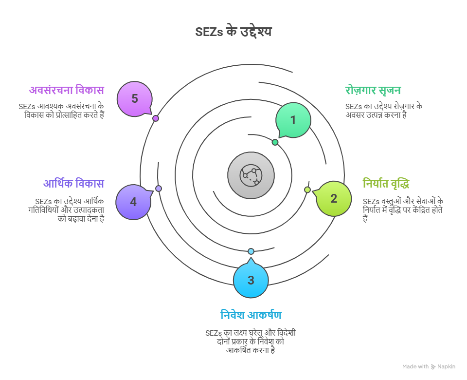 SEZ को व्यापार, विनिर्माण और सेवाओं के लिये शुल्क मुक्त क्षेत्र घोषित किया गया है, जिसका उद्देश्य SEZ अधिनियम, 2005 के तहत निर्यात, FDI एवं औद्योगिक विकास को बढ़ावा देना है।