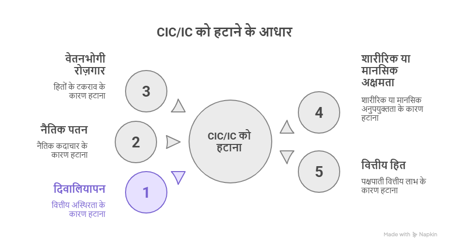 - कार्यकाल और सेवा शर्तें: मुख्य सूचना आयुक्त या सूचना आयुक्त (IC) उस अवधि तक पद धारण करेंगे, जो केंद्रीय सरकार द्वारा निर्धारित की जाती है, या 65 वर्ष की आयु तक, जो भी पहले हो।