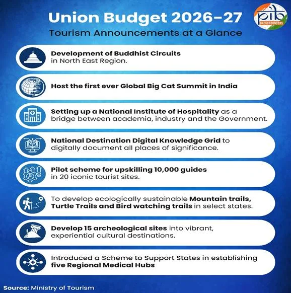 - बजट 2026-27 बौद्ध सर्किट, ईको-ट्रेल, ग्लोबल बिग कैट समिट, नेशनल इंस्टीट्यूट ऑफ हॉस्पिटैलिटी, गाइड करने वालों के कौशल विकास, विरासत स्थलों, मेडिकल हब और पूर्वोदय विकास के साथ पर्यटन को बढ़ावा देता है।