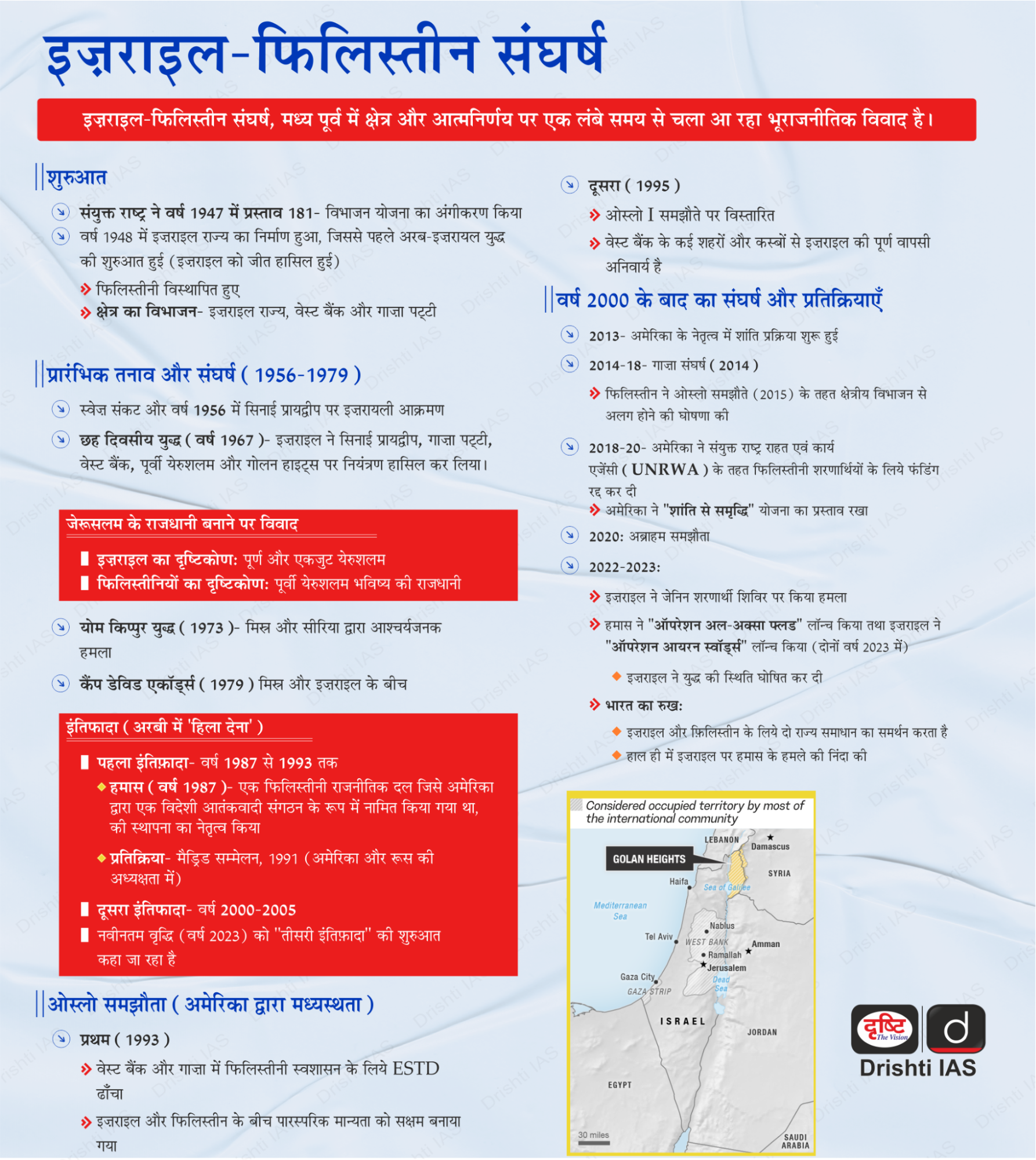 - इज़रायल-फिलिस्तीन संघर्ष में गाज़ा की भूमिका: रणनीतिक रूप से महत्त्वपूर्ण क्षेत्र के रूप में, गाज़ा पट्टी इज़रायल-फिलिस्तीनी संघर्ष के केंद्र में बनी हुई है, जो निरंतर मानवीय, राजनीतिक और सुरक्षा चुनौतियों का सामना कर रही है।