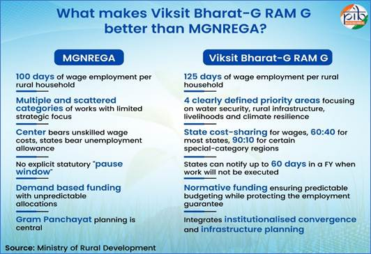 - VB–G RAM G विधेयक, 2025 सार्वभौमिक, मांग-आधारित कार्य के अधिकार से हटकर बजट-सीमित, आपूर्ति-प्रेरित मॉडल की ओर परिवर्तन करता है, जिसमें योजनाबद्ध परिसंपत्ति सृजन पर ज़ोर दिया गया है।