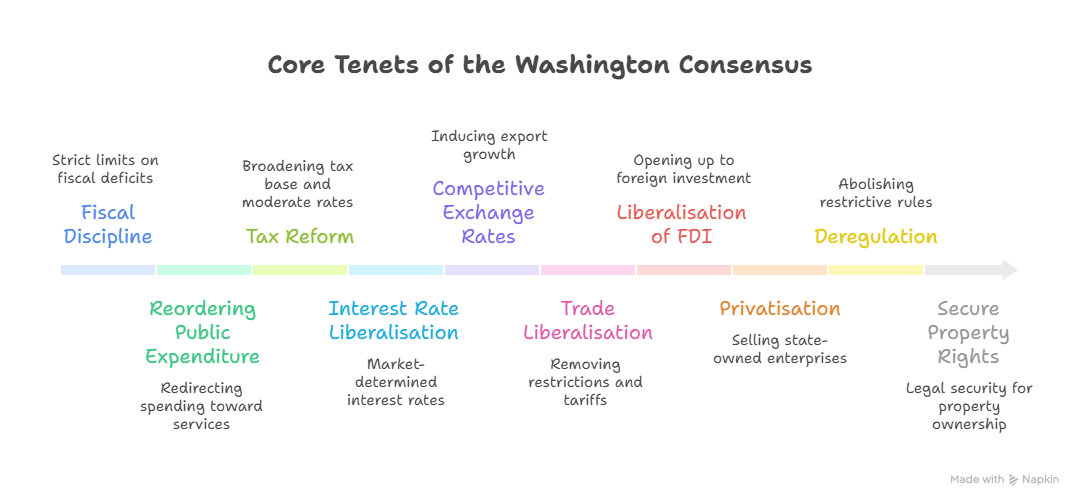 - मुख्य सिद्धांत: इस कंसेंसस ने मूल रूप से उदारीकरण, निजीकरण, वैश्वीकरण और विनियमन में ढील/डीरेगुलेशन की नव-उदारवादी विचारधारा को बढ़ावा दिया, ताकि बाज़ार-प्रेरित आर्थिक विकास को प्रोत्साहित किया जा सके।