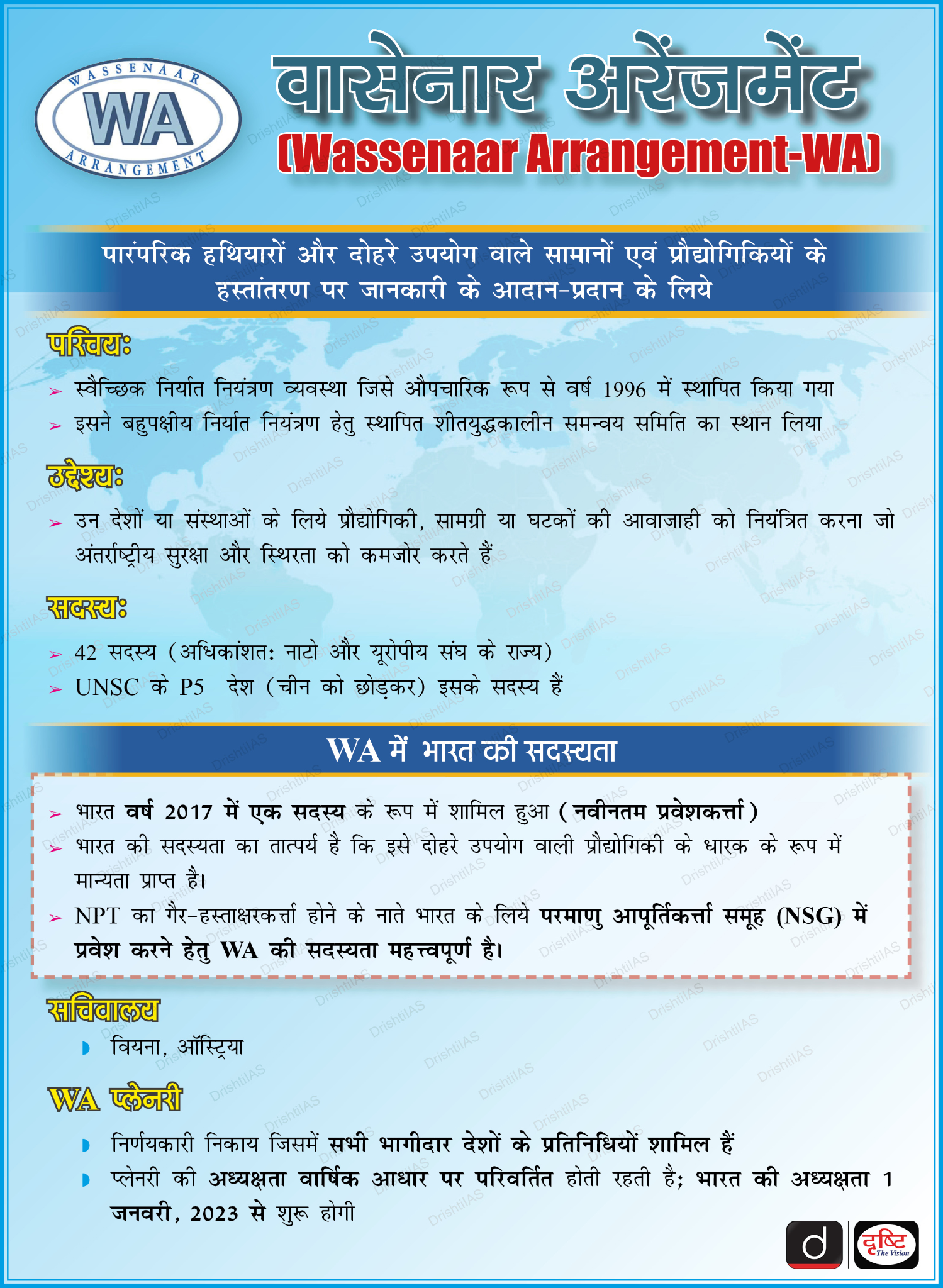 वैश्विक सुरक्षा को बढ़ाने के लिये पारंपरिक हथियारों और दोहरे उपयोग वाली प्रौद्योगिकियों को नियंत्रित करने वाली वर्ष 1996 की बहुपक्षीय व्यवस्था।