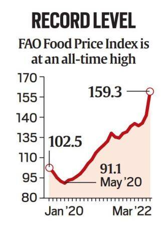 संयुक्त राष्ट्र के खाद्य और कृषि संगठन (FAO) के अनुसार, विश्व खाद्य मूल्य सूचकांक (World Food Price Index) मार्च में औसतन 159.3 अंक रहा, जिसने 11 साल पहले (फरवरी 2011) के 137.6 अंकों के पुराने रिकॉर्ड को तोड़ दिया है।