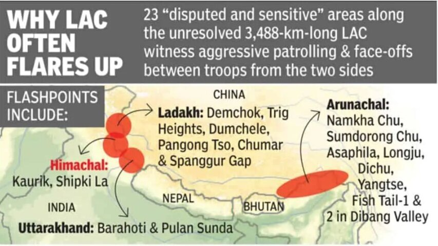 - क्षेत्रीय विभाजन: वास्तविक नियंत्रण रेखा (LAC) को तीन क्षेत्रों में विभाजित किया जाता है— पश्चिमी क्षेत्र (लद्दाख/अक्साई चिन), जहाँ सबसे अधिक तनाव देखा जाता है; मध्य क्षेत्र (उत्तराखंड/हिमाचल प्रदेश), जो अपेक्षाकृत सबसे कम विवादित क्षेत्र है तथा पूर्वी क्षेत्र (अरुणाचल प्रदेश/सिक्किम), जो मुख्यतः मैकमोहन रेखा का अनुसरण करता है।