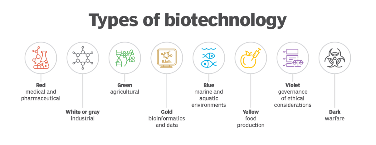 - कृषि (ग्रीन): कीटों, सूखे और रोगों के प्रति प्रतिरोधी फसलें विकसित करती है और खाद्य सुरक्षा में सुधार के लिये पोषण संबंधी प्रोफाइल को बढ़ाती है (जैसे, विटामिन-A से भरपूर गोल्डन राइस ) ।