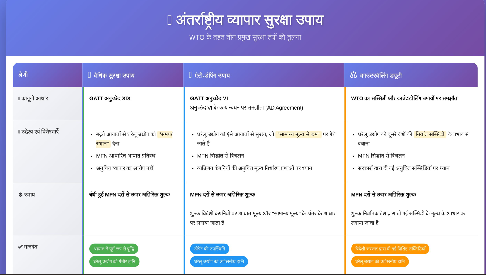 - इसका प्राथमिक उद्देश्य घरेलू उद्योगों को अनुचित मूल्य वाले विदेशी आयातों से होने वाले नुकसान से बचाना है।