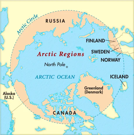 - यह क्षेत्र आर्कटिक वृत्त (66°34′ उत्तरी अक्षांश) के उत्तर में स्थित है, जिसका केंद्र उत्तरी ध्रुव है। इसमें आर्कटिक महासागर तथा आठ देशों– कनाडा, डेनमार्क (ग्रीनलैंड), फिनलैंड, आइसलैंड, नॉर्वे, रूस, स्वीडन और संयुक्त राज्य अमेरिका के कुछ भाग सम्मिलित हैं, जो मिलकर आर्कटिक परिषद का गठन करते हैं।