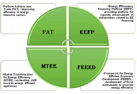 - संवर्द्धित ऊर्जा दक्षता पर राष्ट्रीय मिशन (NMEEE): यह जलवायु परिवर्तन पर अपनी राष्ट्रीय कार्य योजना (NAPCC) के तहत आठ राष्ट्रीय मिशन में से एक है। NMEEE में ऊर्जा गहन उद्योग में ऊर्जा दक्षता बढ़ाने के लिये चार पहल शामिल हैं, जो इस प्रकार हैं: