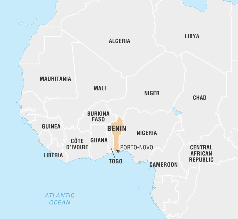 - बेनिन और इसकी सीमाएँ: बेनिन पश्चिम अफ्रीका में स्थित है। इसकी सीमाएँ टोगो (पश्चिम), नाइजीरिया (पूर्व), बुर्किना फासो (उत्तर-पश्चिम) और नाइजर (उत्तर) से लगती हैं।