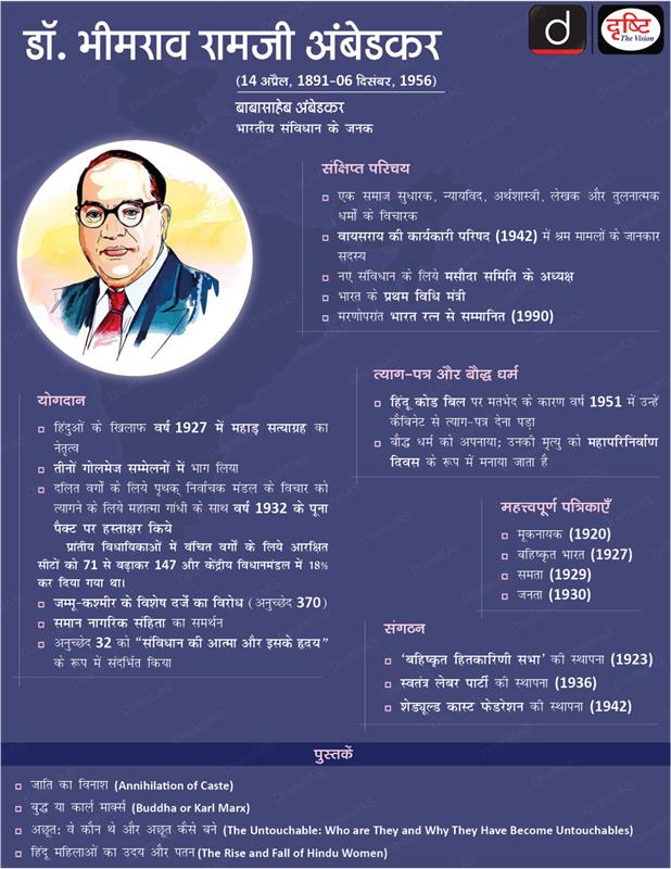 - उनकी प्रमुख रचनाएँ, जैसे– ‘एनीहिलेशन ऑफ कास्ट’ (1936), ‘द अनटचेबल’ (1948), ‘बुद्ध और कार्ल मार्क्स’ (1956) और ‘बुद्ध एंड हिज़ धम्म’ (1957) सामाजिक न्याय और समानता पर आधारित महत्त्वपूर्ण आधारभूत ग्रंथ हैं।