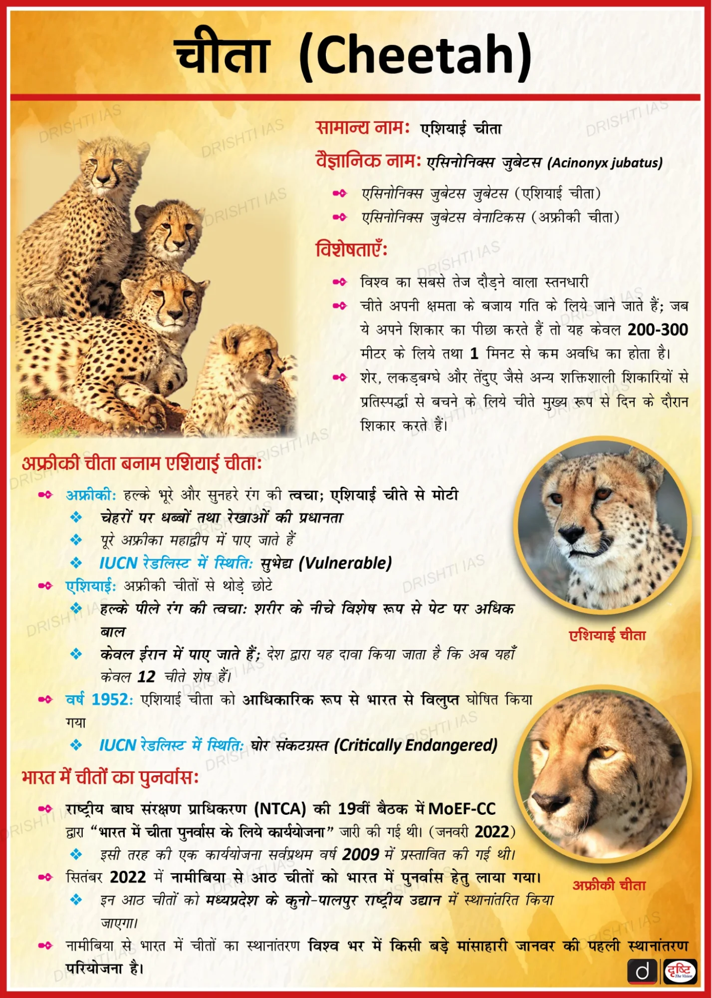 - परिचय: इसका आरंभ वर्ष 2022 में प्रोजेक्ट टाइगर के तहत किया गया था। प्रोजेक्ट चीता का उद्देश्य उन चीताओं को भारत में पुनः लाना है जो 1952 में विलुप्त हो गए थे। यह विश्व की पहली ऐसी अंतरमहाद्वीपीय पुनर्स्थापन परियोजना है जिसके अंतर्गत जंगली माँसाहारी जीवों का पुनःपरिचय किया जा रहा है।