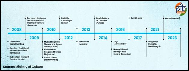 - भारत के पास अब UNESCO सूची में कई ICH तत्त्व शामिल हैं, जिनमें गरबा, दुर्गा पूजा, कुंभ मेला, योग, नवरोज़, संकीर्तन, बौद्ध मंत्रोच्चारण, छऊ, कालबेलिया, मुदियेत्टु, रम्मन, कुटियत्तम, रामलीला और वैदिक मंत्रोच्चारण शामिल हैं।