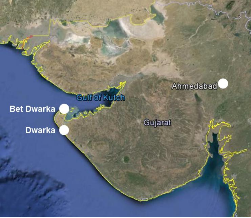 - परिचय: द्वारका बेसिन (जलमग्न द्वारका शहर) गुजरात, भारत के आधुनिक द्वारका और बेट द्वारका के तट के पास स्थित एक शृंखला है, जिसमें जल-पुरातात्त्विक अवशेष पाए जाते हैं। यह गुजरात के सौराष्ट्र प्रायद्वीप के पश्चिमी छोर पर स्थित है।