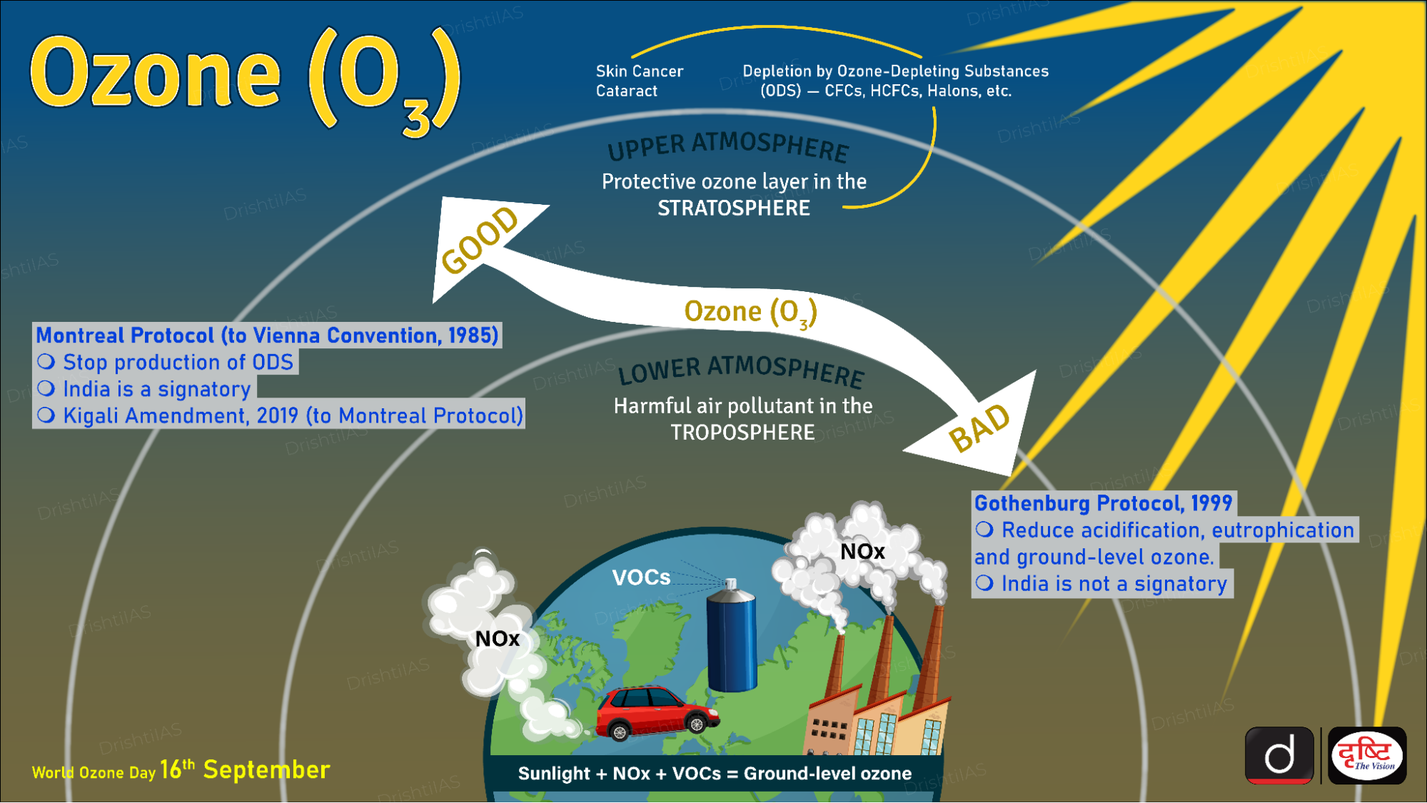 - समतापमंडलीय ओज़ोन (गुड ओज़ोन): पृथ्वी से 15-30 किमी ऊपर ऑक्सीजन के साथ पराबैंगनी विकिरण की परस्पर अभिक्रिया द्वारा प्राकृतिक रूप से निर्मित होती है। हानिकारक पराबैंगनी किरणों को अवशोषित करके पृथ्वी के सनस्क्रीन के रूप में काम करती है।