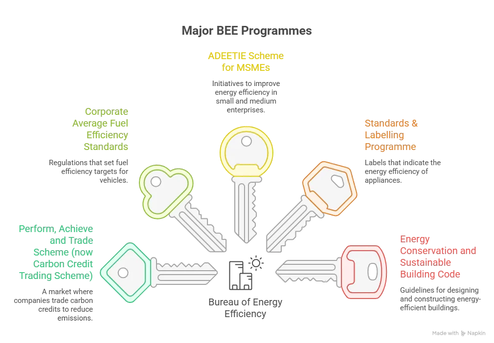 - संस्थागत समन्वय: BEE राज्य निर्दिष्ट एजेंसियों (SDA) के माध्यम से राज्य स्तर पर ऊर्जा दक्षता कार्यक्रमों को कार्यान्वित करता है, जिससे राष्ट्रीय ऊर्जा संरक्षण नीतियों का संघीय समन्वय एवं स्थानीय कार्यान्वयन सुनिश्चित होता है।