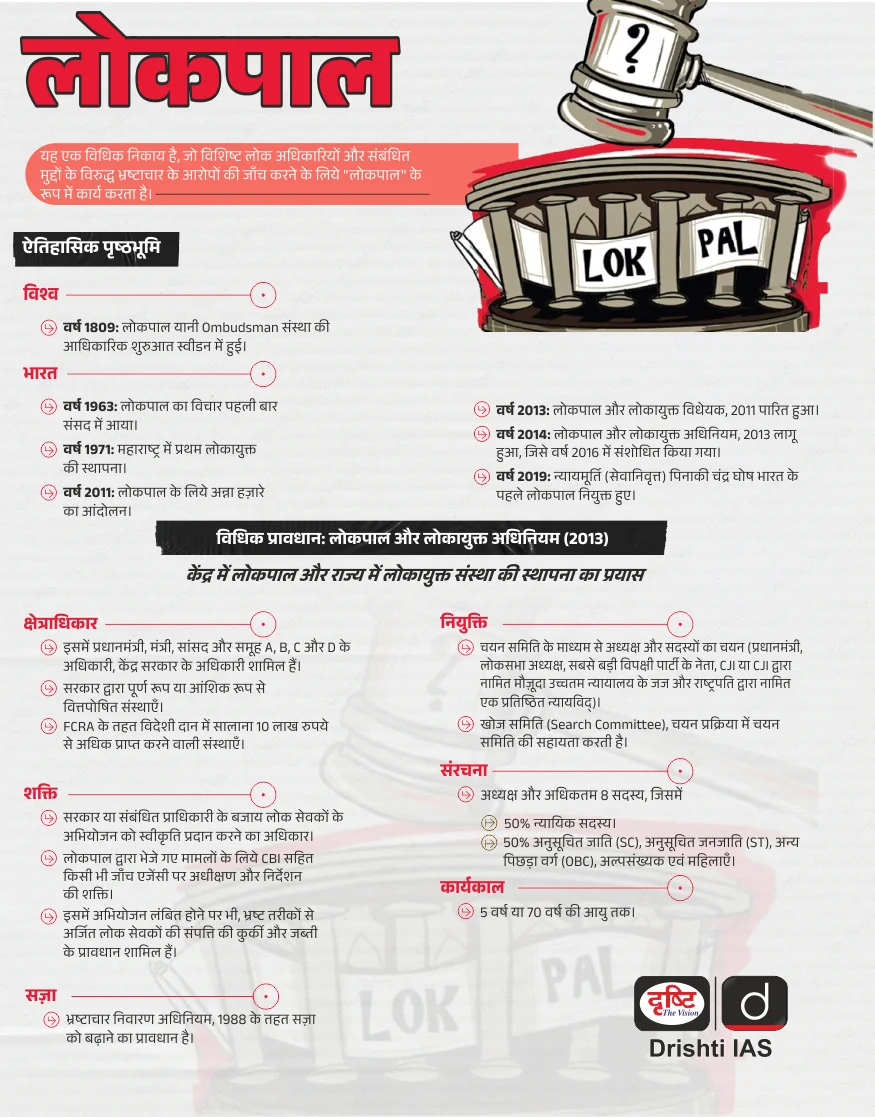 - लोकपाल का महत्त्व: लोकपाल भारत के भ्रष्टाचार-विरोधी ढाँचे को सुदृढ़ करता है, क्योंकि यह उच्च सरकारी पदाधिकारियों को जवाबदेह ठहराने के लिये एक स्वतंत्र, वैधानिक तंत्र प्रदान करता है।