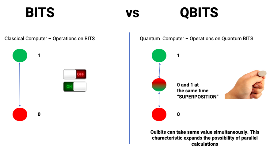 - क्यूबिट (क्वांटम बिट): क्वांटम इनफार्मेशन की मूल इकाई, जो एक साथ 0,1 या दोनों अवस्थाओं में (सुपरपोज़िशन की स्थिति में) रह सकती है।