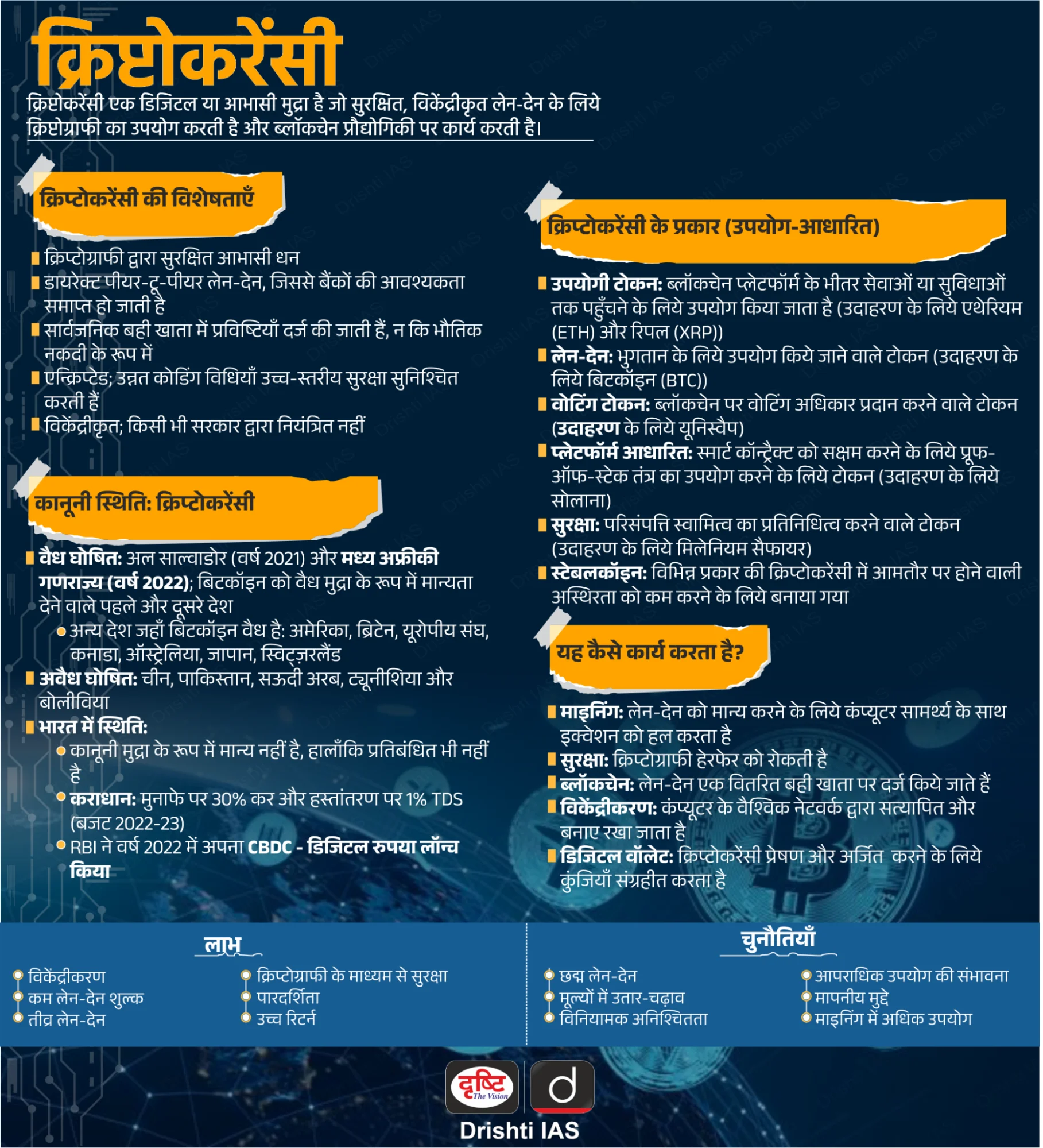- भारत में क्रिप्टोकरेंसी कानूनी निविदा नहीं है, लेकिन यह आय-कर कानून के अंतर्गत कर योग्य है।