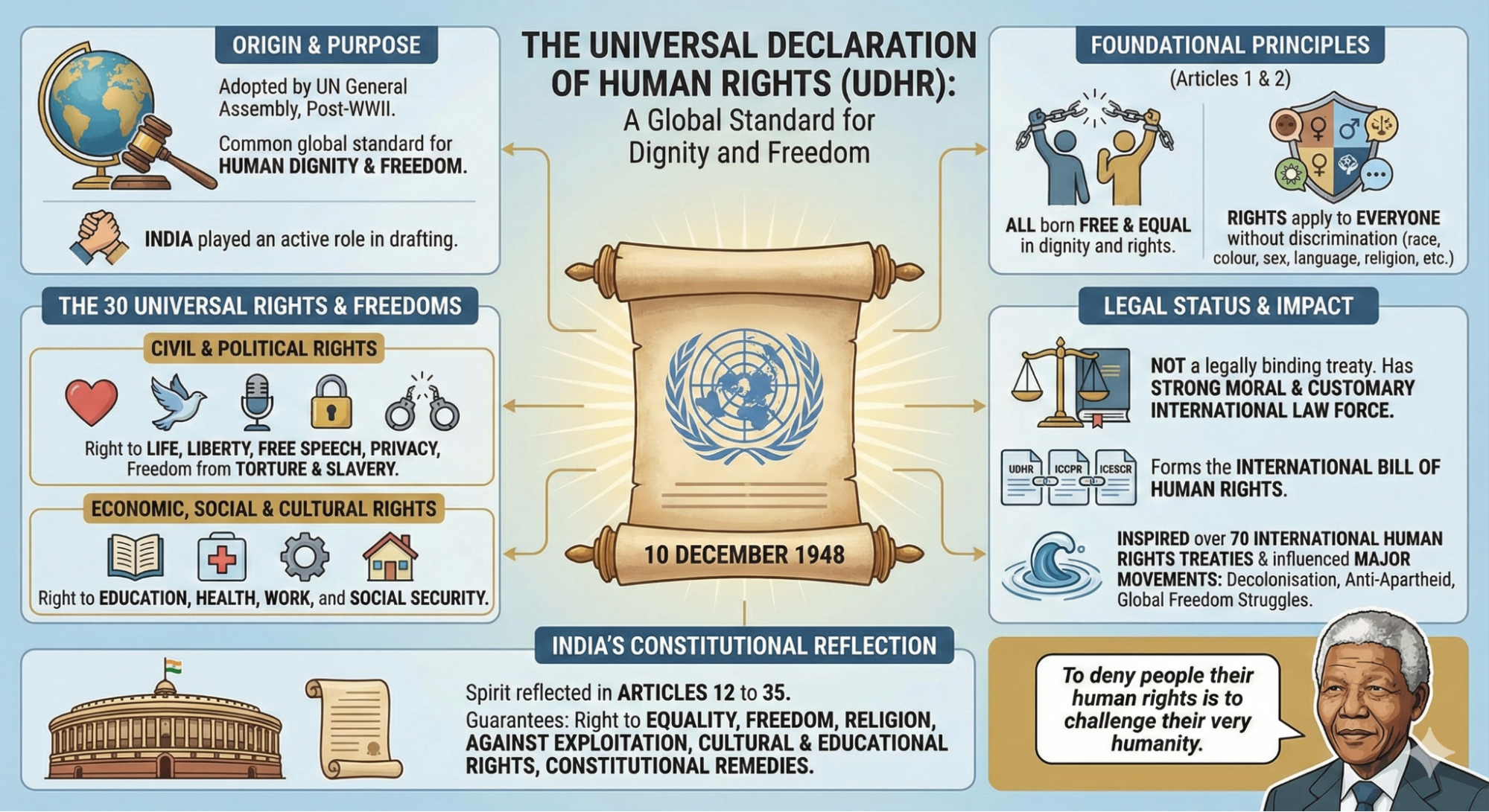 मानवाधिकार दिवस प्रत्येक वर्ष 10 दिसंबर को वर्ष 1948 में मानव अधिकारों की सार्वभौमिक घोषणा (UDHR) को अपनाए जाने की स्मृति में मनाया जाता है, जो गरिमा, समानता और स्वतंत्रता के प्रति वैश्विक प्रतिबद्धता की पुष्टि करता है।