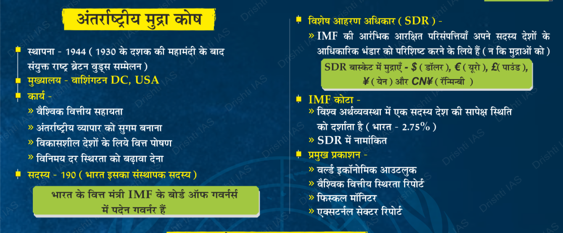 - इन अनुच्छेदों में IMF के प्रमुख कार्यों जैसे वैश्विक मौद्रिक निगरानी, ज़रूरतमंद देशों को ऋण देना और तकनीकी सहायता प्रदान करना आदि का प्रावधान है।